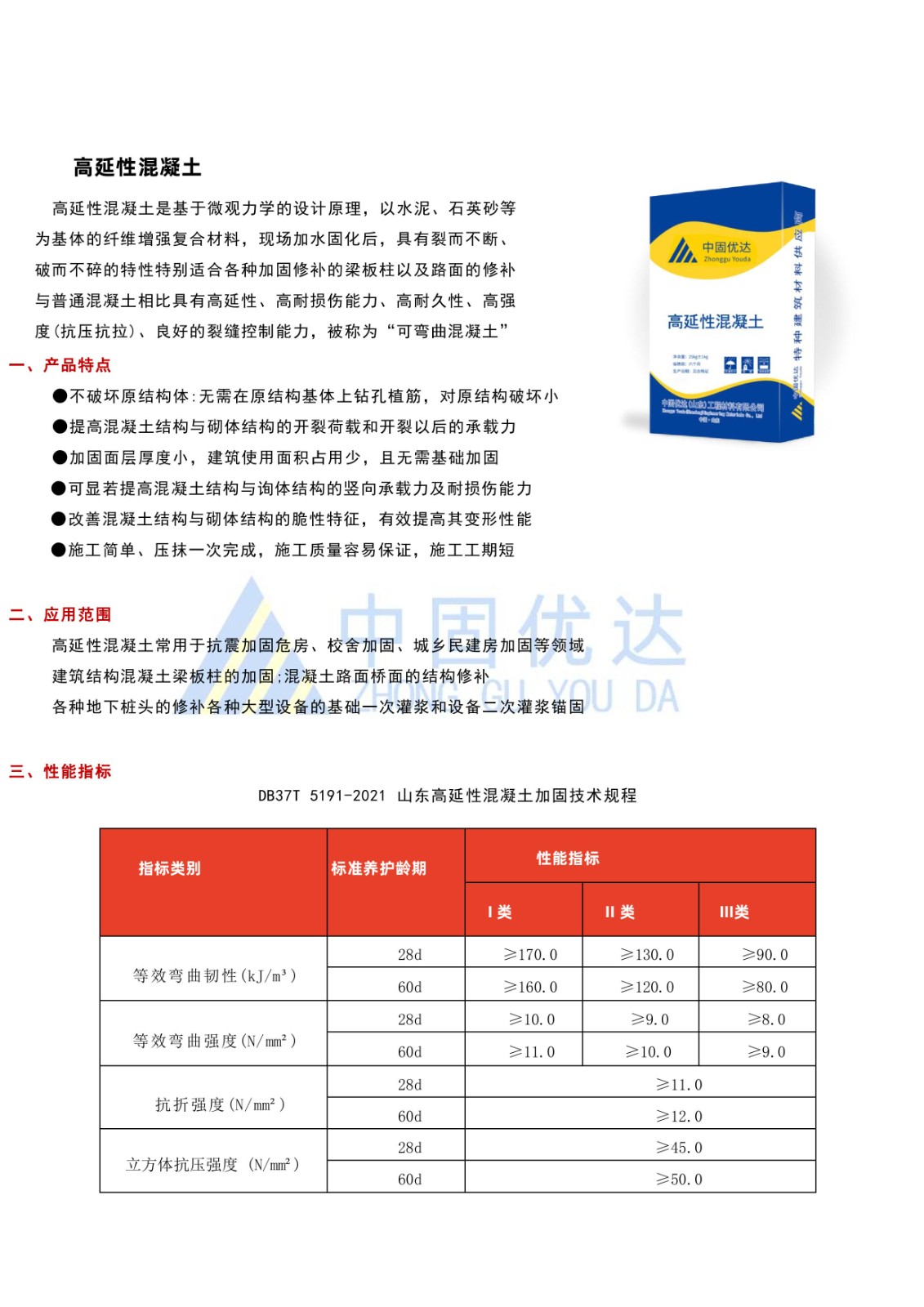 高延性混凝土 高延性混凝土是具有高抗裂性、高延展性、高韌性、高耐損傷的一種高富纖維混凝土,采用特種水泥和骨料,輔助高韌性高彈性纖維和外加劑混合而成,現(xiàn)場加水固化后,具有裂而不斷、破而不碎的特性,用于各加固修補(bǔ)的梁板柱以及路面的修補(bǔ)。
